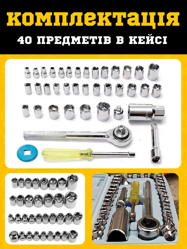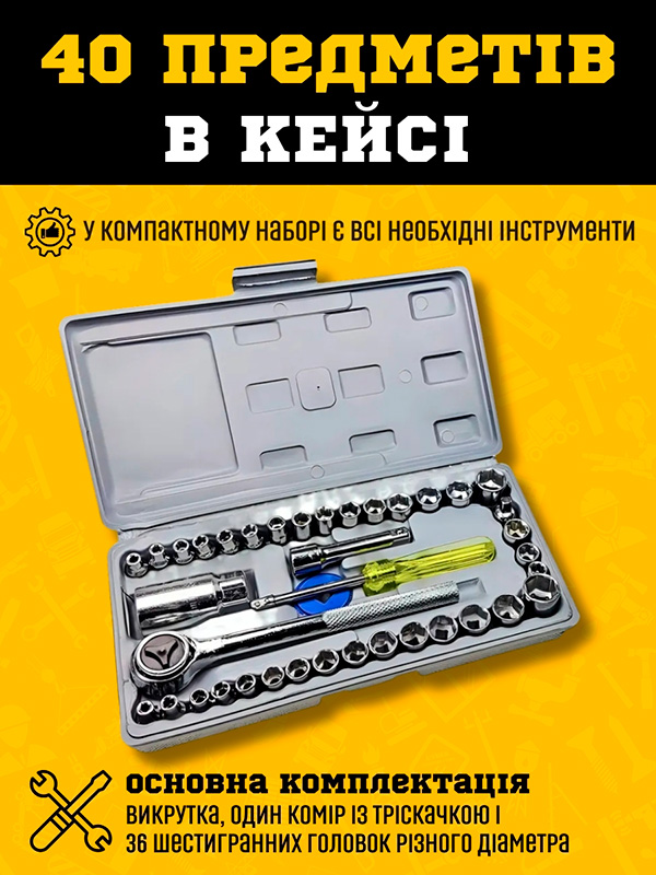 Набір інструментів у кейсі 40 предметів — це універсальний комплект для щоденних ремонтних робіт, обслуговування техніки, автомобільних задач та побутового використання. Він містить 36 шестигранних головок різного діаметра, що дозволяє працювати з широким спектром кріплень.